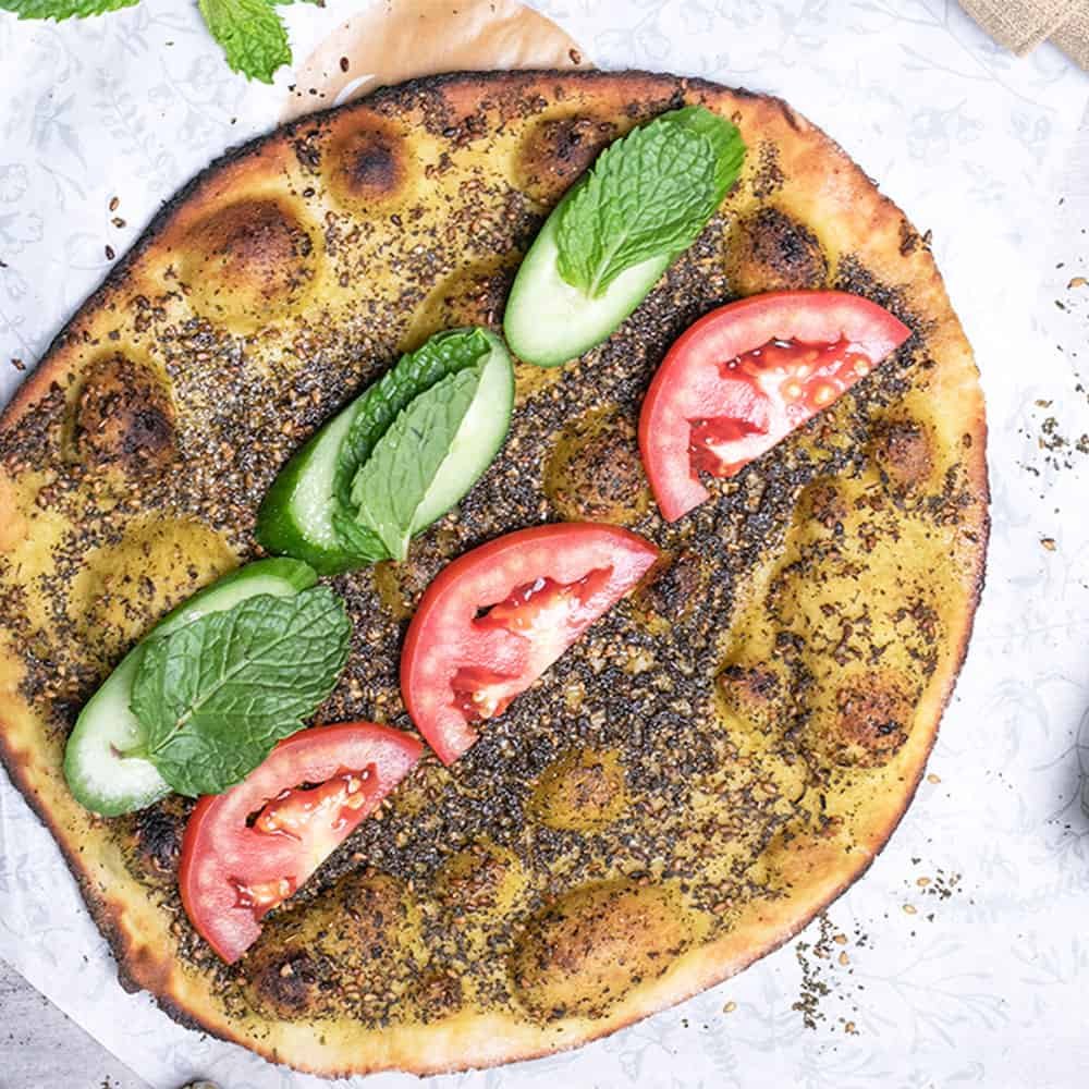 عجينة مشروحة مع الخضار الطازجة مثل البقدونس، النعنع، البندورة، والبصل مع لمسة زعتر أو جبنة