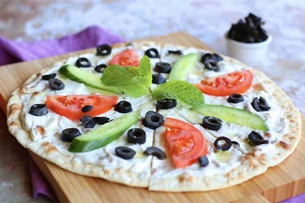 عجينة مشروحة مع لبنة محشوة باللبنة الطازجة مع لمسة من الخضار الطازجة وزيت الزيتون