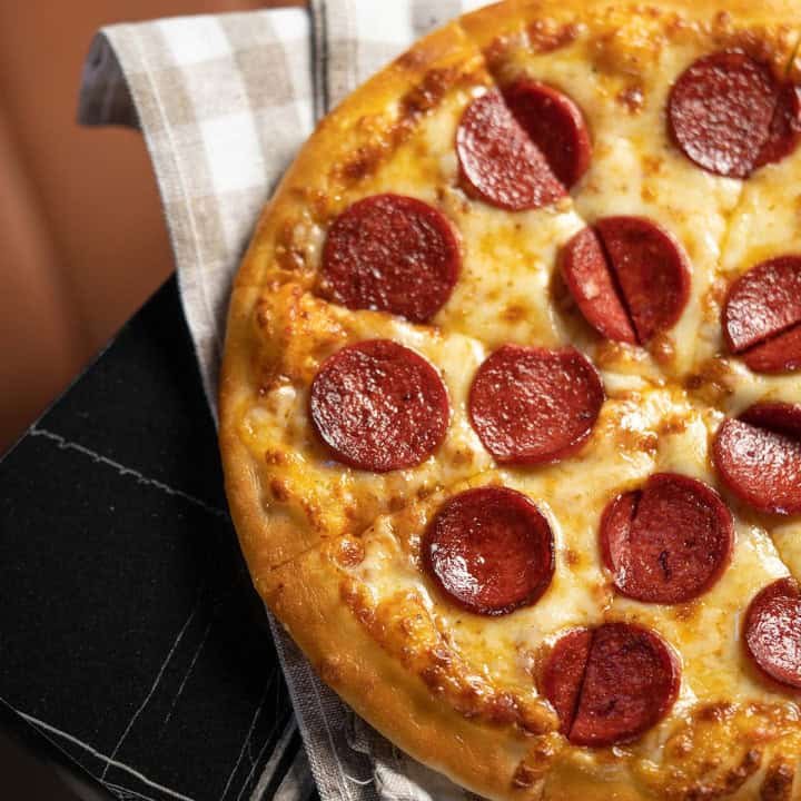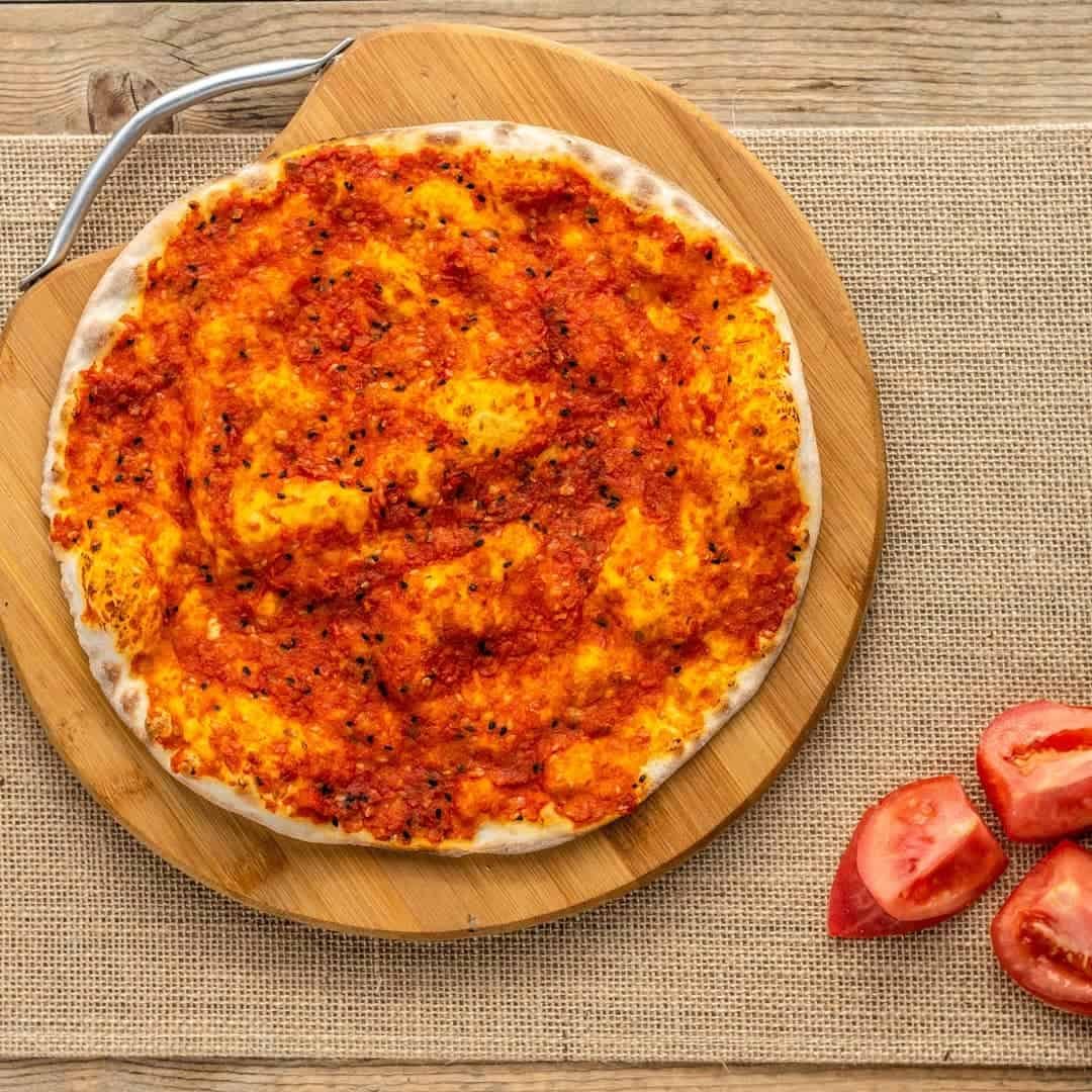 عجينة مدهونة بصلصة الطماطم، مع جبنة موزاريلا وشرائح بيبروني