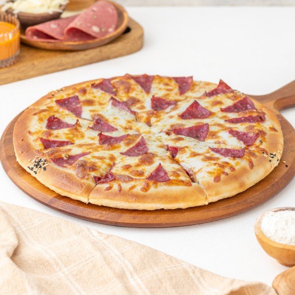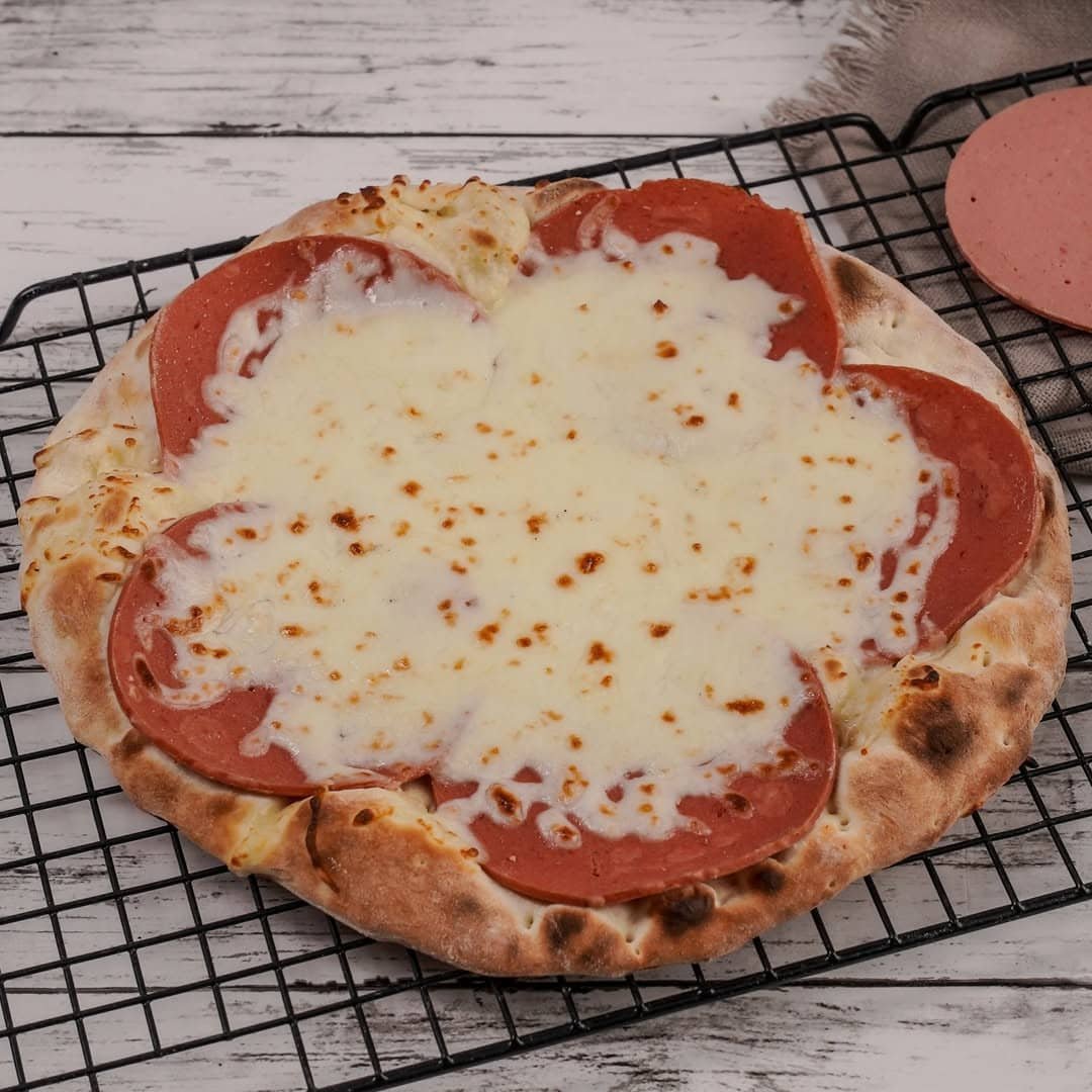 عجينة بيتزا مدهونة بصلصة الطماطم، مع طبقة غنية من الجبنة وشرائح المرتديلا