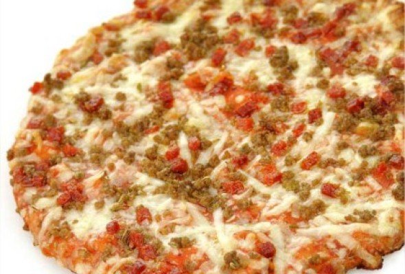 عجينة بيتزا مدهونة بصلصة الطماطم، مع سجق وجبنة موزاريلا
