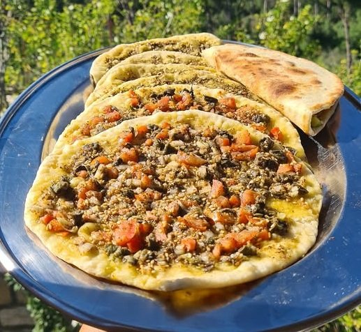عجينة مدهونة بخلطة الزعتر البلدي مع لمسة من البقدونس والطماطم الطازجة