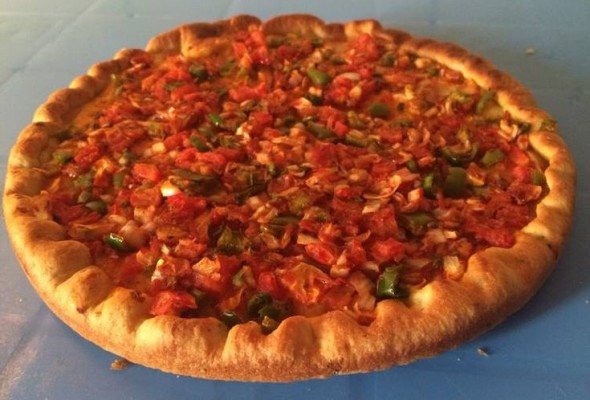 عجينة مشروحة مع خليط المحمرة الحارة مع طبقة من الجبنة