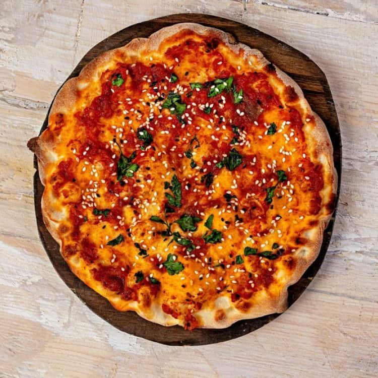 عجينة بيتزا مدهونة بصلصة الطماطم، مع شرائح الحبش وجبنة موزاريلا